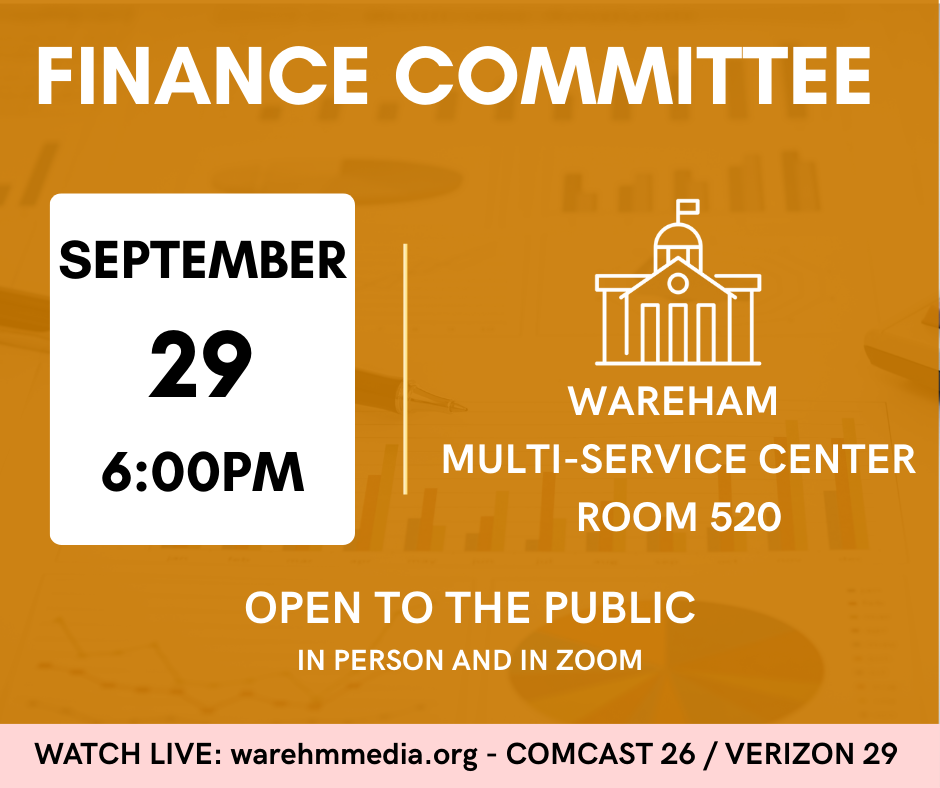 The Finance Committee will convene Monday September 29th, 6:00PM at the Wareham Multi-Service Center.