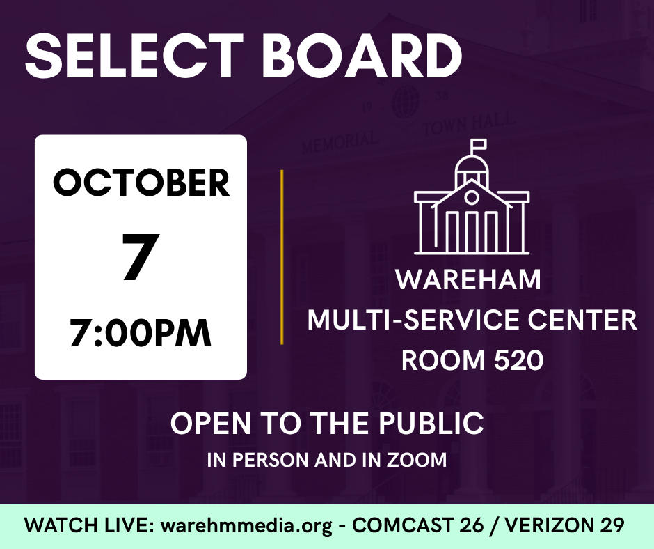 The Select Board will convene Tuesday September 16th, 7:00PM at the Wareham Multi-Service Center, Room 520.