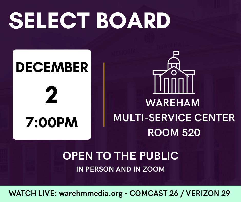 The Wareham Select Board will convene Tuesday November 4th, 7:00PM at the Multi-Service Center.