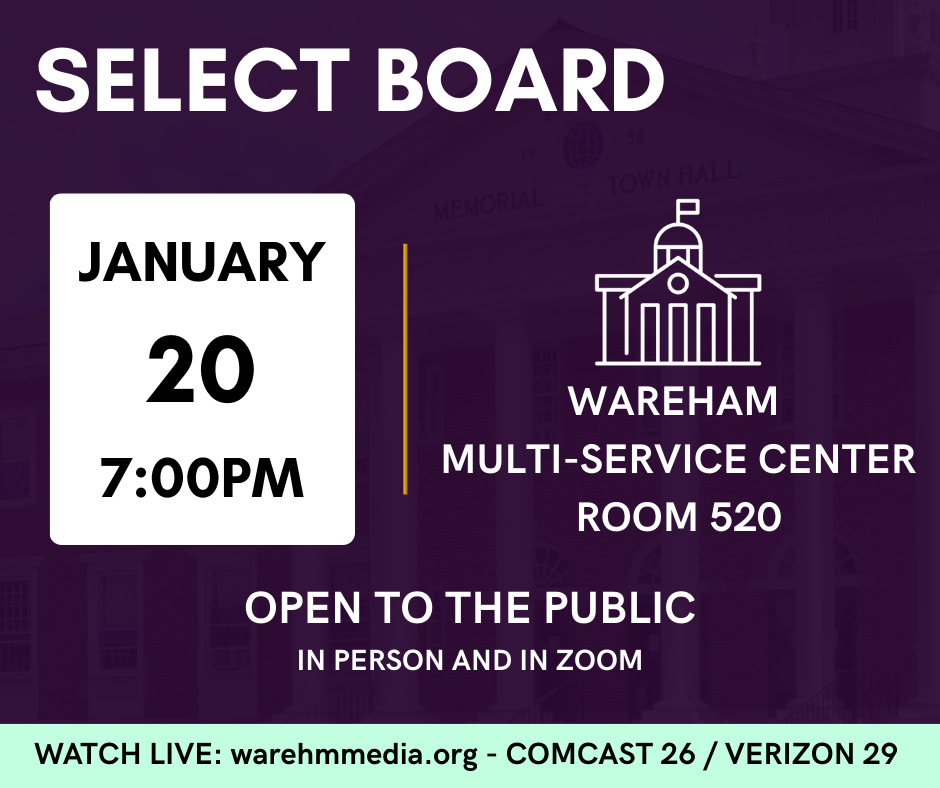 The Select Board will convene Tuesday January 20th, 7:00PM at the Multi-Service Center, Room 520.