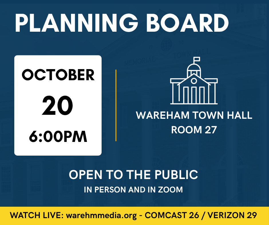 The Wareham Planning Board will convene Monday October 20th, 6:00PM at the Wareham Multi-Service Center, Room 520.