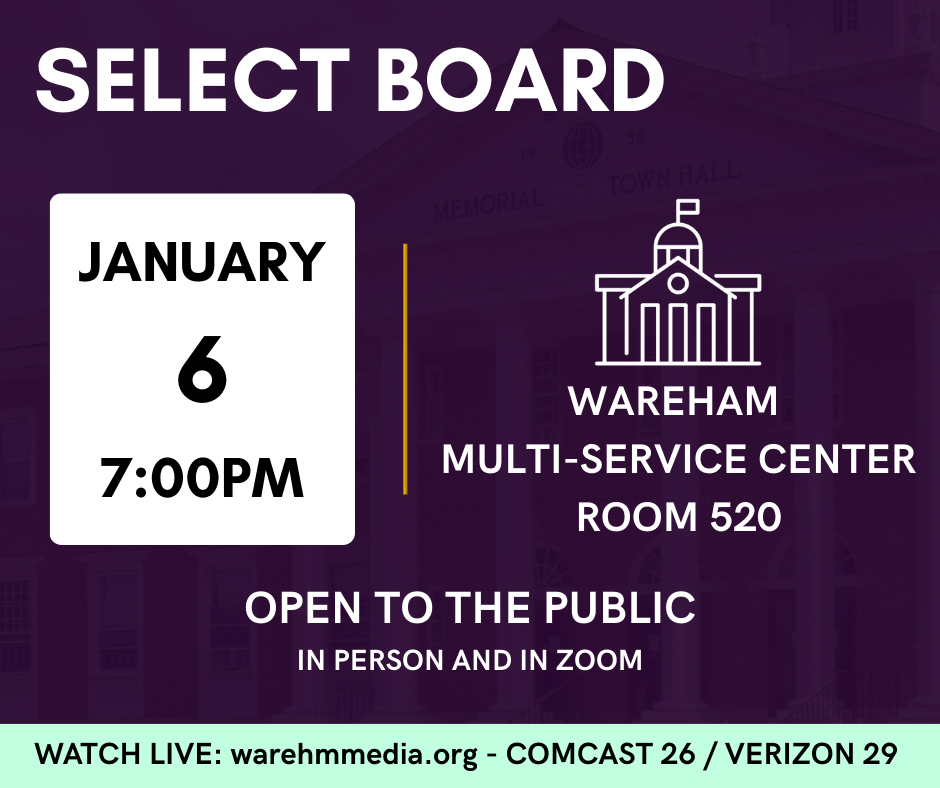 The Wareham Select Board will convene Tuesday January 7th, 7:00PM at the Wareham Multi-Service Center, 48 Marion Road, Room 520.