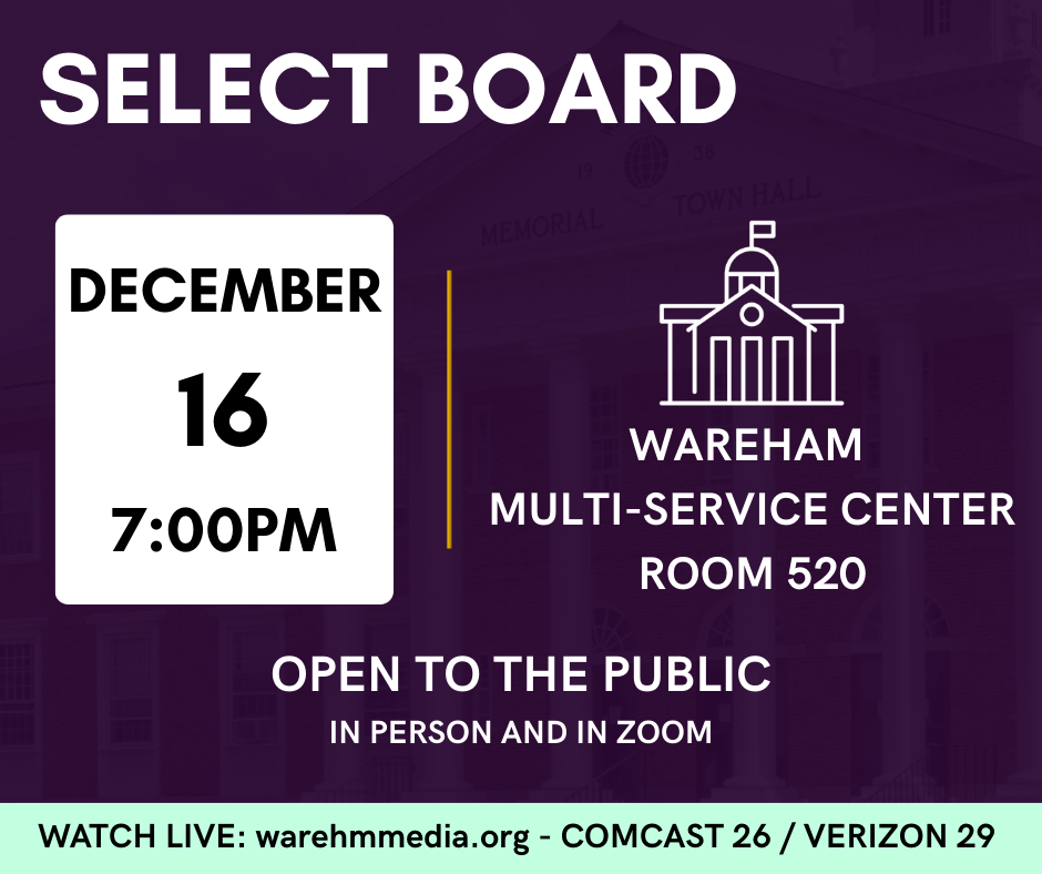 The Wareham Select Board will convene Tuesday December 16th, 7:00PM at the Wareham Multi-Service Center, 48 Marion Road, Room 520.