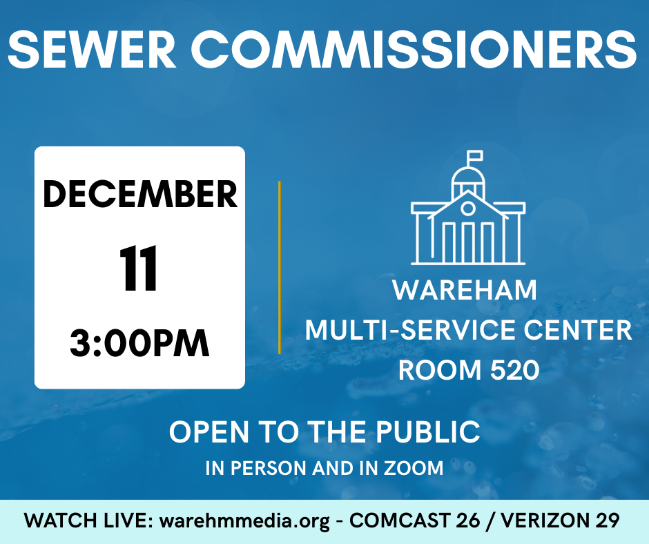 The Wareham Sewer Commissioners will convene Thursday December 11th, 3:00PM at the Wareham Multi-Service Center, 48 Marion Road, Room 520.